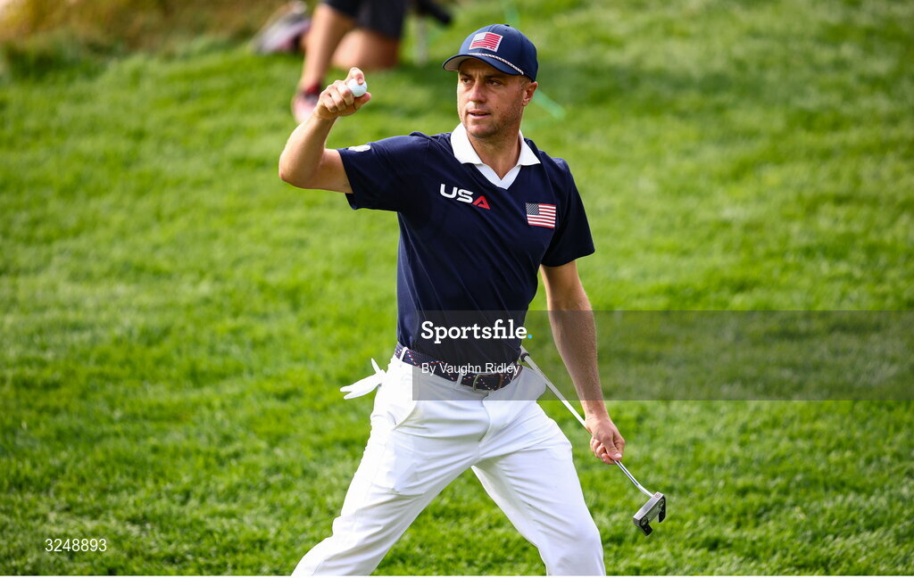 27 September 2025; Justin Thomas of USA celebrates after putting on the eighth green during the afternoon fourballs on day two of the 2025 Ryder Cup at Black Course at Bethpage State Park Golf Course in Farmingdale, New York, USA. Photo by Vaughn Ridley/Sportsfile