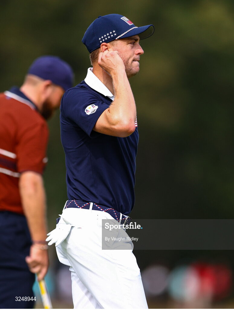 27 September 2025; Justin Thomas of USA reacts after putting on the ninth green during the afternoon fourballs on day two of the 2025 Ryder Cup at Black Course at Bethpage State Park Golf Course in Farmingdale, New York, USA. Photo by Vaughn Ridley/Sportsfile