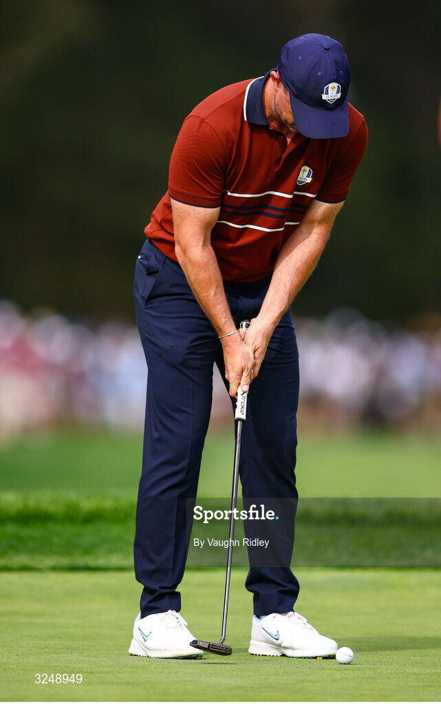 27 September 2025; Rory McIlroy of Europe misses a putt on the ninth green during the afternoon fourballs on day two of the 2025 Ryder Cup at Black Course at Bethpage State Park Golf Course in Farmingdale, New York, USA. Photo by Vaughn Ridley/Sportsfile
