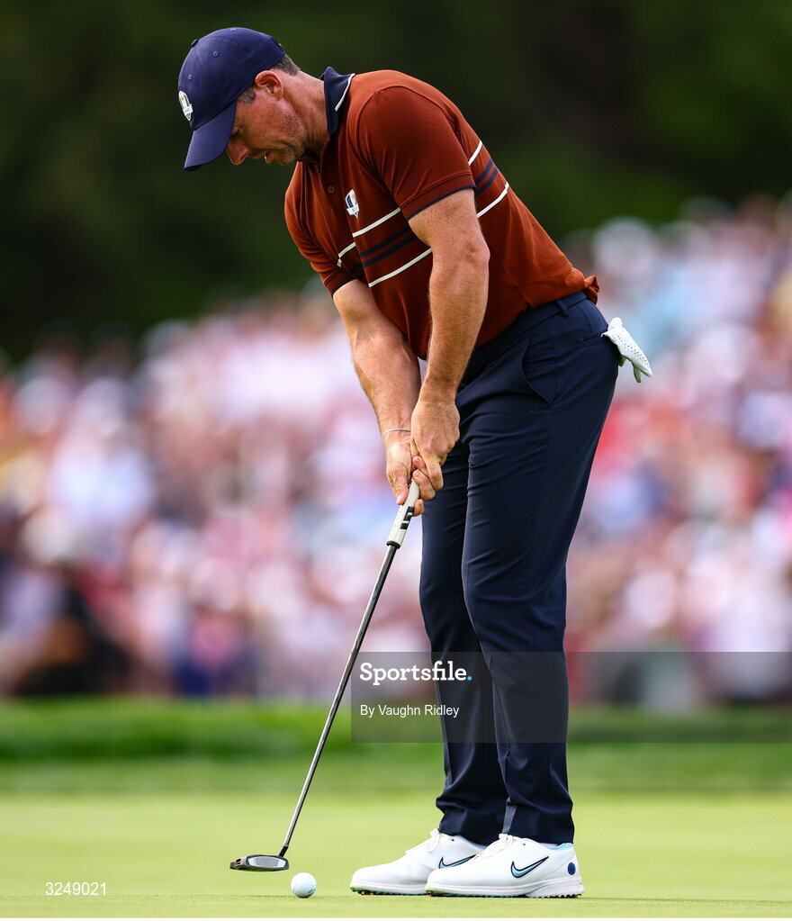 27 September 2025; Rory McIlroy of Europe putts on the 11th green during the afternoon fourballs on day two of the 2025 Ryder Cup at Black Course at Bethpage State Park Golf Course in Farmingdale, New York, USA. Photo by Vaughn Ridley/Sportsfile