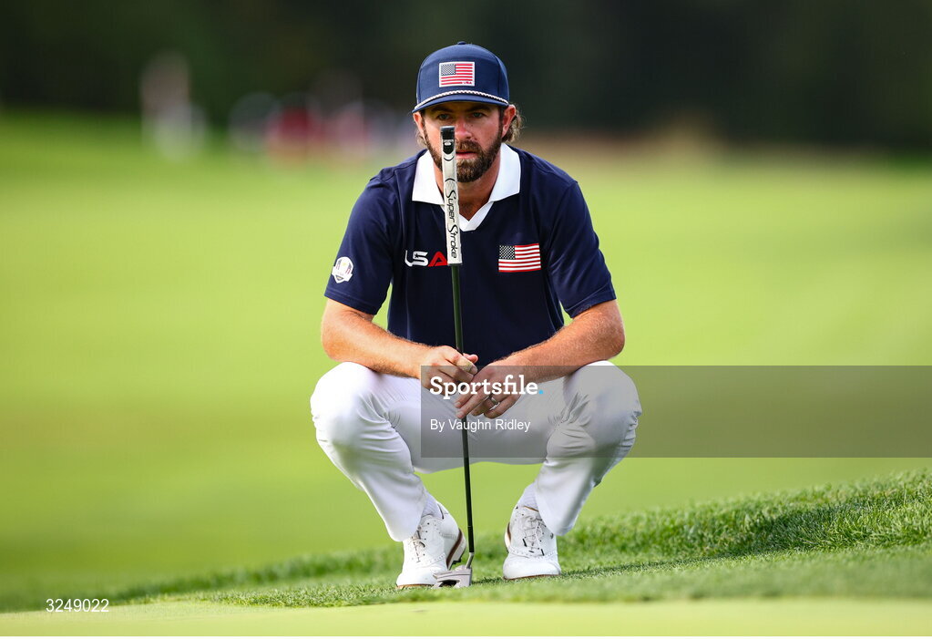 27 September 2025; Cameron Young of USA lines-up a putt on the 11th green during the afternoon fourballs on day two of the 2025 Ryder Cup at Black Course at Bethpage State Park Golf Course in Farmingdale, New York, USA. Photo by Vaughn Ridley/Sportsfile