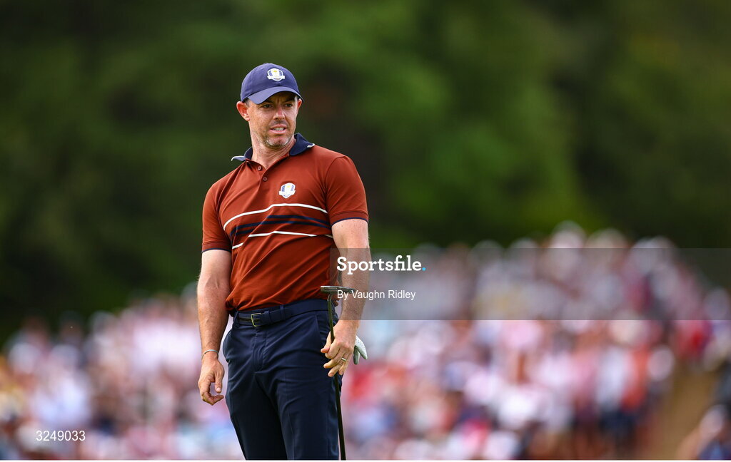 27 September 2025; Rory McIlroy of Europe during the afternoon fourballs on day two of the 2025 Ryder Cup at Black Course at Bethpage State Park Golf Course in Farmingdale, New York, USA. Photo by Vaughn Ridley/Sportsfile