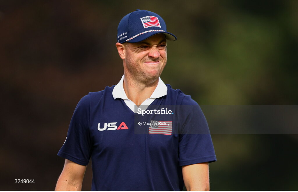 27 September 2025; Justin Thomas of USA reacts after missing a putt on the 12th green during the afternoon fourballs on day two of the 2025 Ryder Cup at Black Course at Bethpage State Park Golf Course in Farmingdale, New York, USA. Photo by Vaughn Ridley/Sportsfile