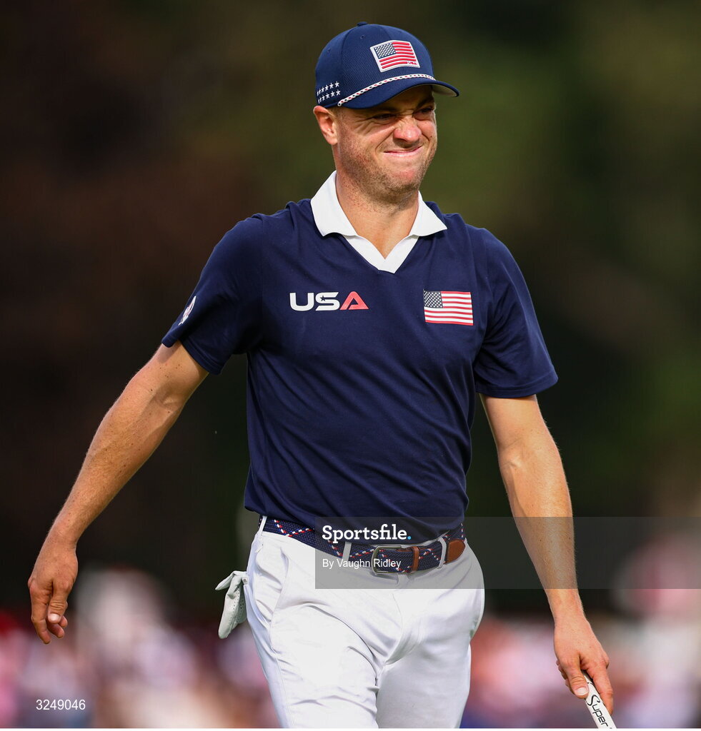 27 September 2025; Justin Thomas of USA reacts after missing a putt on the 12th green during the afternoon fourballs on day two of the 2025 Ryder Cup at Black Course at Bethpage State Park Golf Course in Farmingdale, New York, USA. Photo by Vaughn Ridley/Sportsfile
