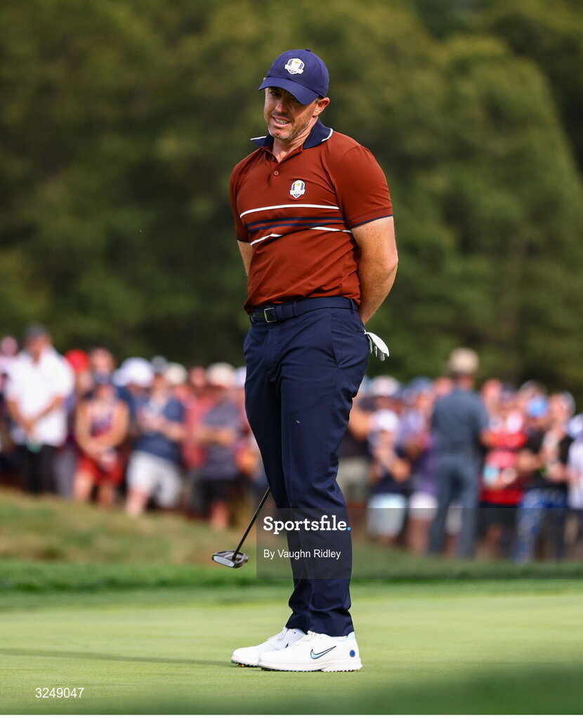 27 September 2025; Rory McIlroy of Europe reacts after missing a putt on the 12th green during the afternoon fourballs on day two of the 2025 Ryder Cup at Black Course at Bethpage State Park Golf Course in Farmingdale, New York, USA. Photo by Vaughn Ridley/Sportsfile