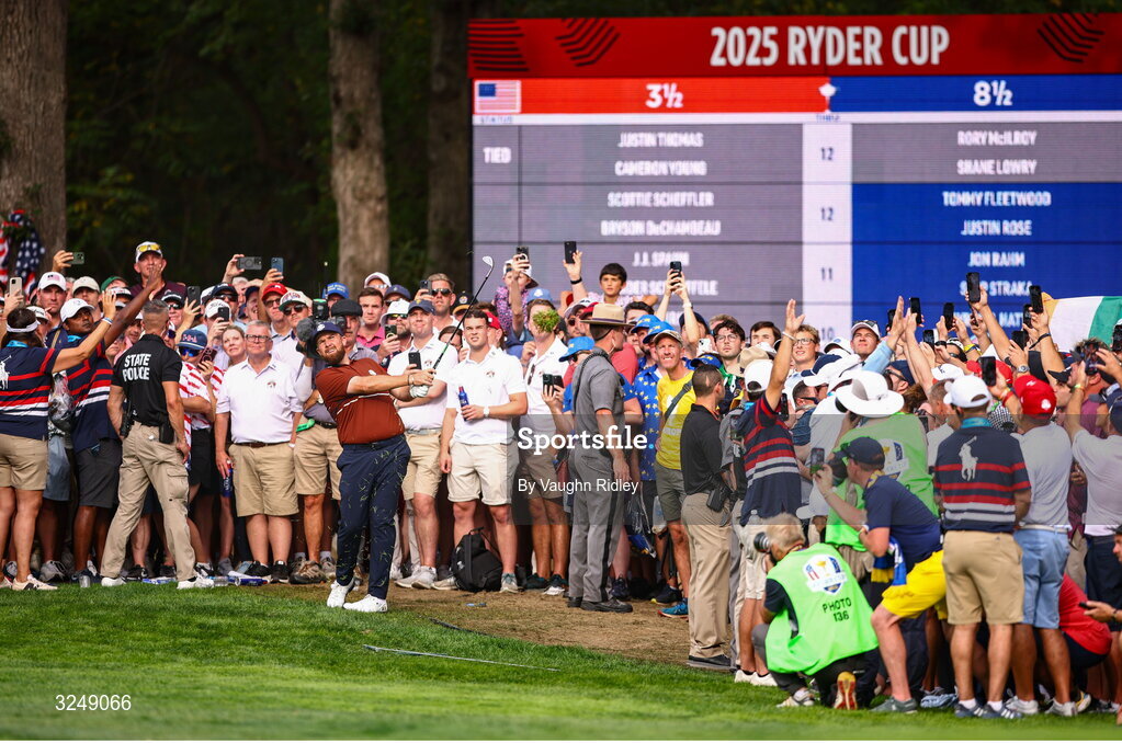 27 September 2025; Shane Lowry of Europe plays from the rough onto the 13th green during the afternoon fourballs on day two of the 2025 Ryder Cup at Black Course at Bethpage State Park Golf Course in Farmingdale, New York, USA. Photo by Vaughn Ridley/Sportsfile