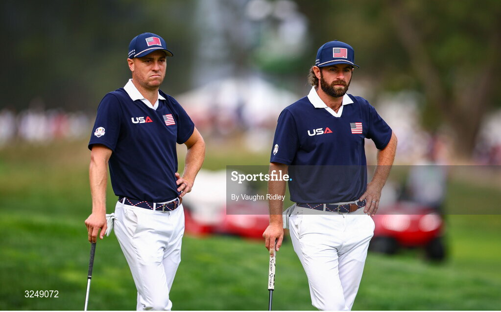 27 September 2025; Justin Thomas of USA, left, and Cameron Young of USA watch on at the 13th green during the afternoon fourballs on day two of the 2025 Ryder Cup at Black Course at Bethpage State Park Golf Course in Farmingdale, New York, USA. Photo by Vaughn Ridley/Sportsfile