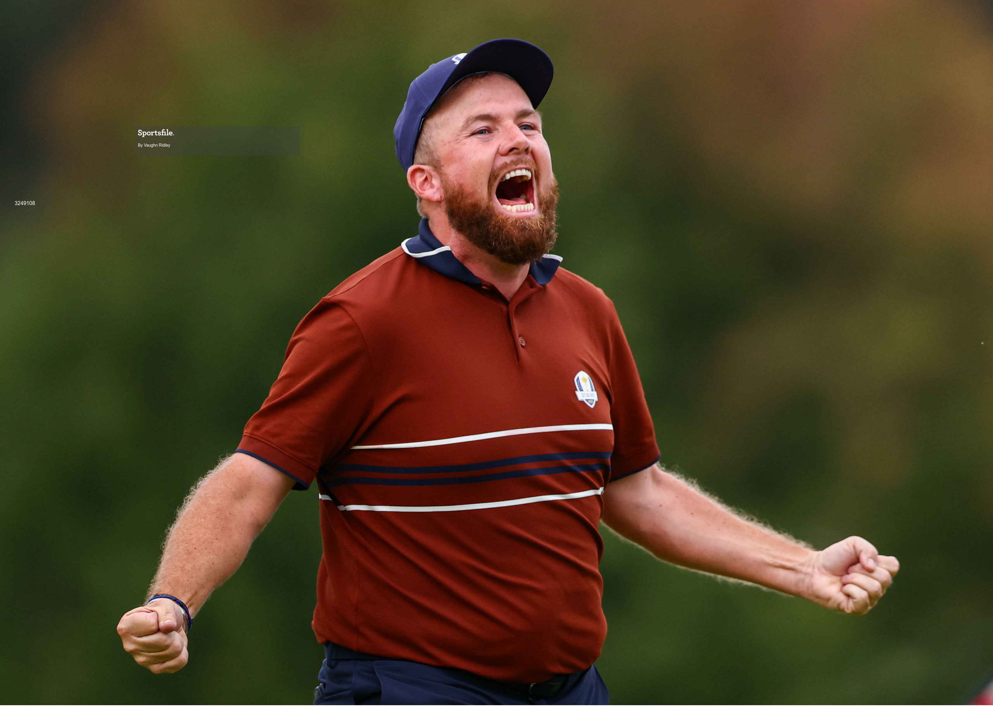 27 September 2025; Shane Lowry of Europe celebrates on the 18th green during the afternoon fourballs on day two of the 2025 Ryder Cup at Black Course at Bethpage State Park Golf Course in Farmingdale, New York, USA. Photo by Vaughn Ridley/Sportsfile