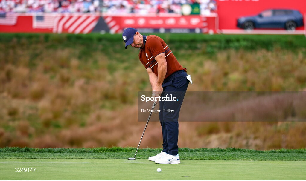 27 September 2025; Rory McIlroy of Europe putts on the 14th green during the afternoon fourballs on day two of the 2025 Ryder Cup at Black Course at Bethpage State Park Golf Course in Farmingdale, New York, USA. Photo by Vaughn Ridley/Sportsfile