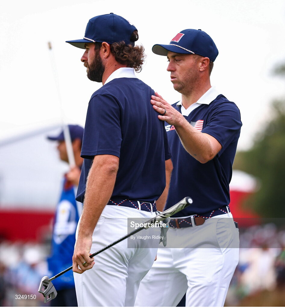 27 September 2025; Justin Thomas of USA, right, and Cameron Young of USA during the afternoon fourballs on day two of the 2025 Ryder Cup at Black Course at Bethpage State Park Golf Course in Farmingdale, New York, USA. Photo by Vaughn Ridley/Sportsfile