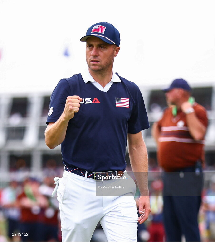 27 September 2025; Justin Thomas of USA celebrates as Cameron Young of USA, not pictured, putts on the 16th green during the afternoon fourballs on day two of the 2025 Ryder Cup at Black Course at Bethpage State Park Golf Course in Farmingdale, New York, USA. Photo by Vaughn Ridley/Sportsfile