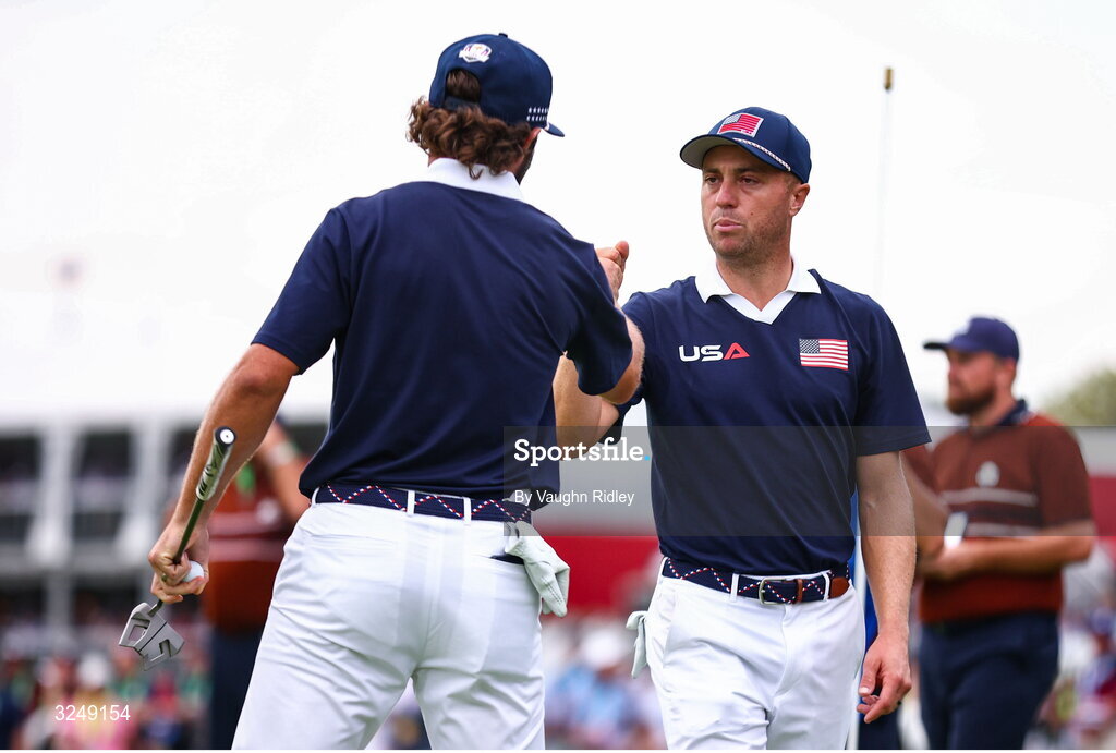 27 September 2025; Justin Thomas of USA, right, and Cameron Young of USA during the afternoon fourballs on day two of the 2025 Ryder Cup at Black Course at Bethpage State Park Golf Course in Farmingdale, New York, USA. Photo by Vaughn Ridley/Sportsfile