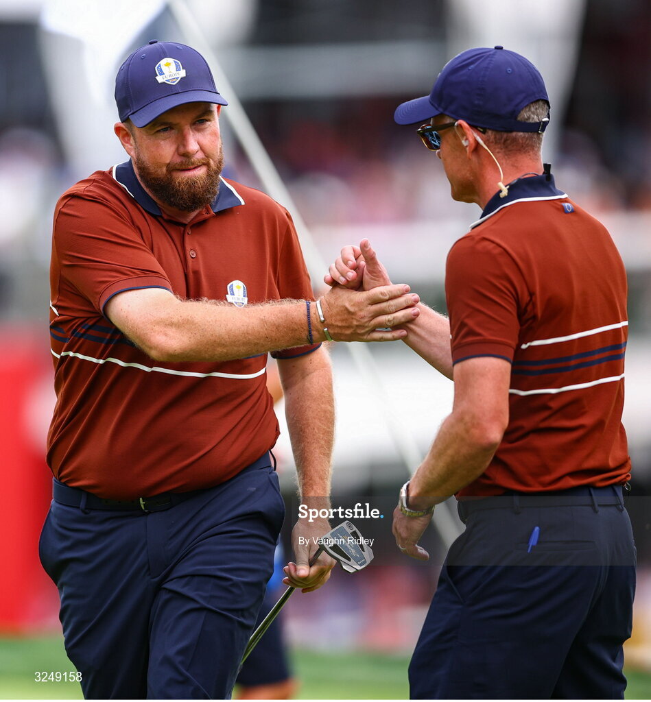 27 September 2025; Shane Lowry of Europe is congratulated by Europe captain Luke Donald after putting on the 16th green during the afternoon fourballs on day two of the 2025 Ryder Cup at Black Course at Bethpage State Park Golf Course in Farmingdale, New York, USA. Photo by Vaughn Ridley/Sportsfile