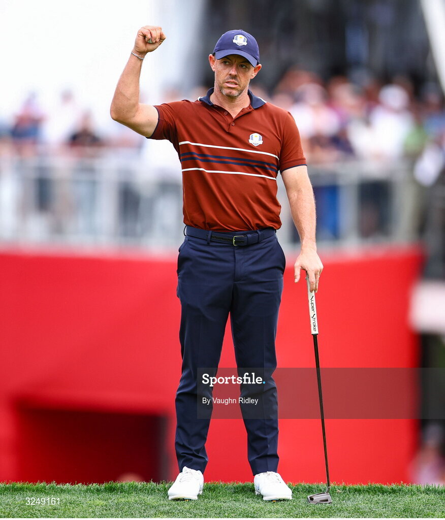 27 September 2025; Rory McIlroy of Europe celebrates after Shane Lowry of Europe, not pictured, putts on the 16th green during the afternoon fourballs on day two of the 2025 Ryder Cup at Black Course at Bethpage State Park Golf Course in Farmingdale, New York, USA. Photo by Vaughn Ridley/Sportsfile