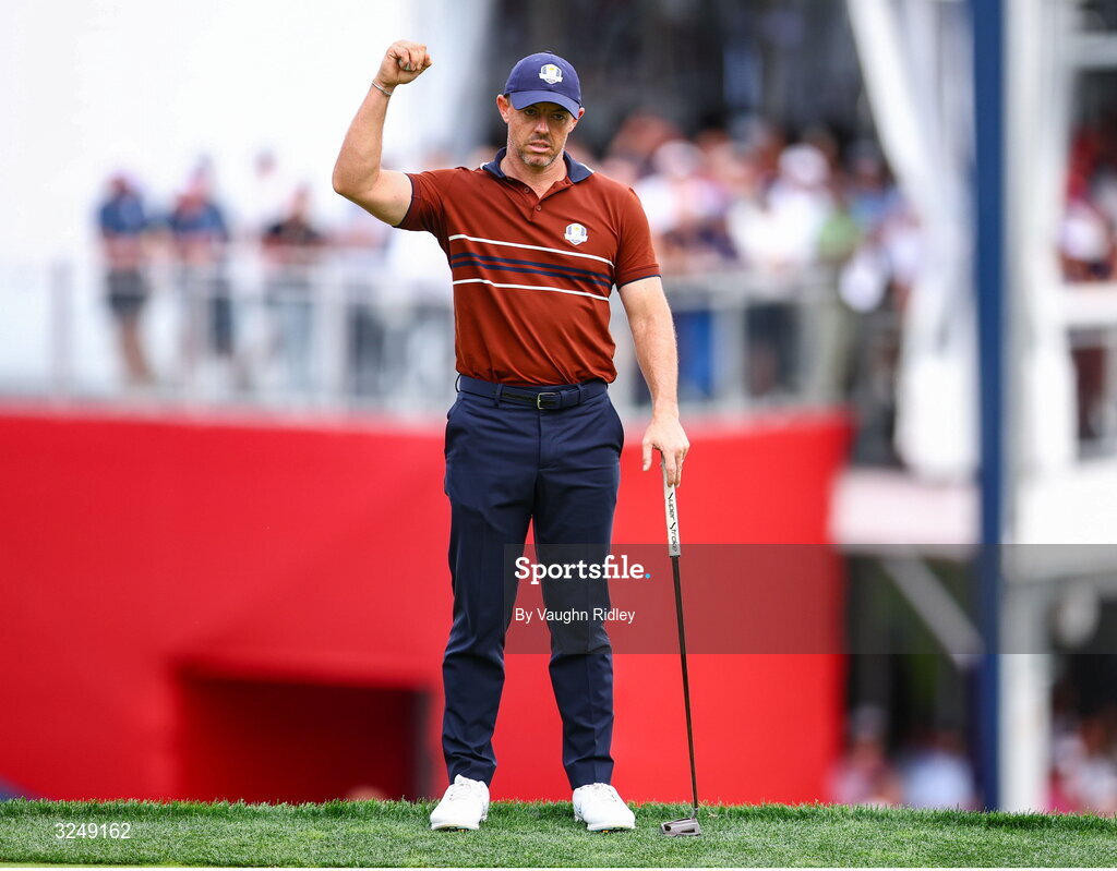 27 September 2025; Rory McIlroy of Europe celebrates after Shane Lowry of Europe, not pictured, putts on the 16th green during the afternoon fourballs on day two of the 2025 Ryder Cup at Black Course at Bethpage State Park Golf Course in Farmingdale, New York, USA. Photo by Vaughn Ridley/Sportsfile