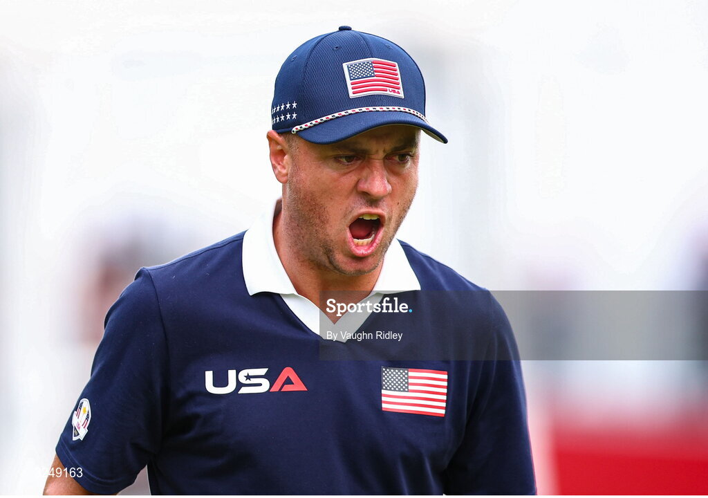 27 September 2025; Justin Thomas of USA celebrates after putting on the 16th green during the afternoon fourballs on day two of the 2025 Ryder Cup at Black Course at Bethpage State Park Golf Course in Farmingdale, New York, USA. Photo by Vaughn Ridley/Sportsfile