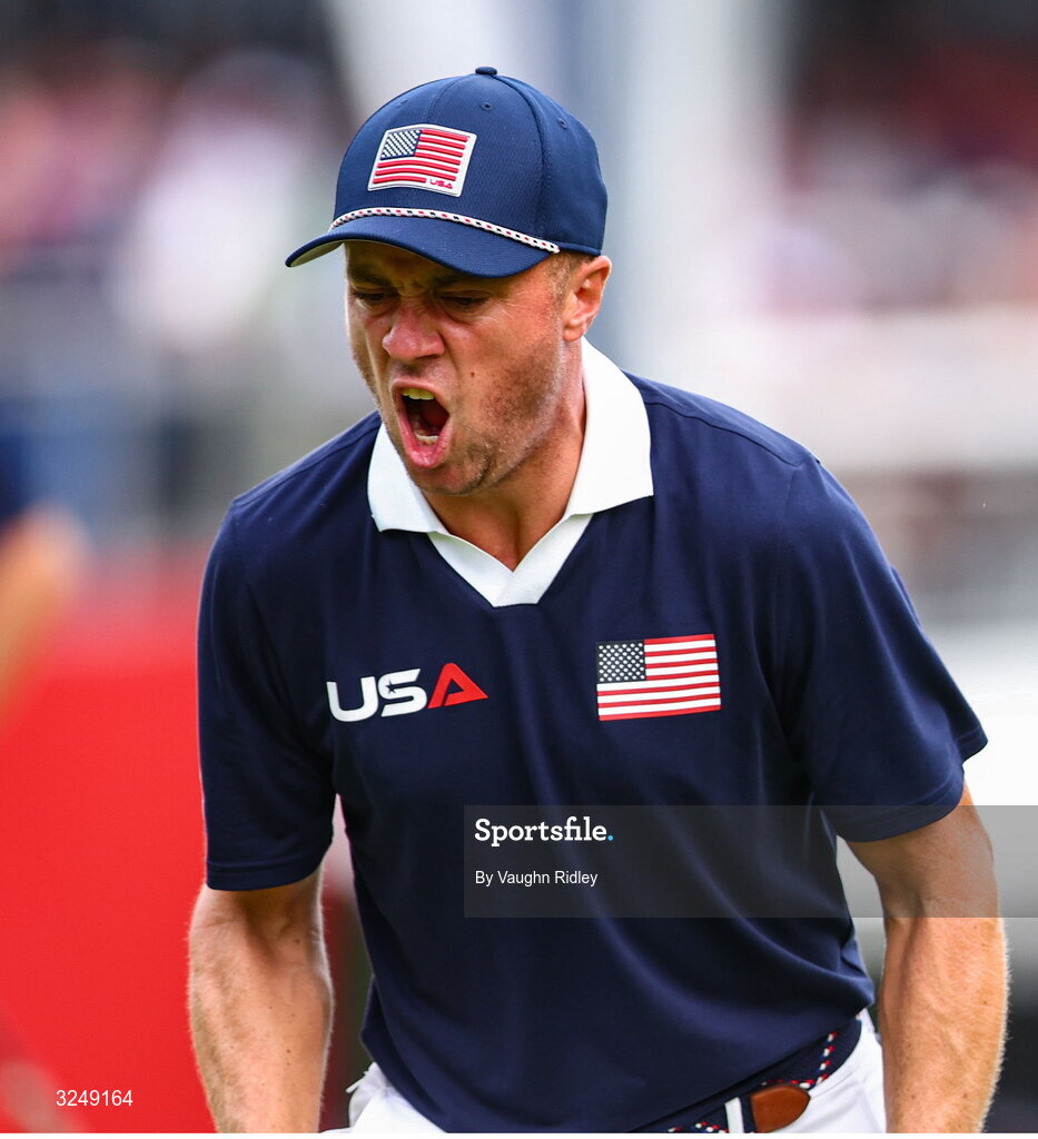27 September 2025; Justin Thomas of USA celebrates after putting on the 16th green during the afternoon fourballs on day two of the 2025 Ryder Cup at Black Course at Bethpage State Park Golf Course in Farmingdale, New York, USA. Photo by Vaughn Ridley/Sportsfile