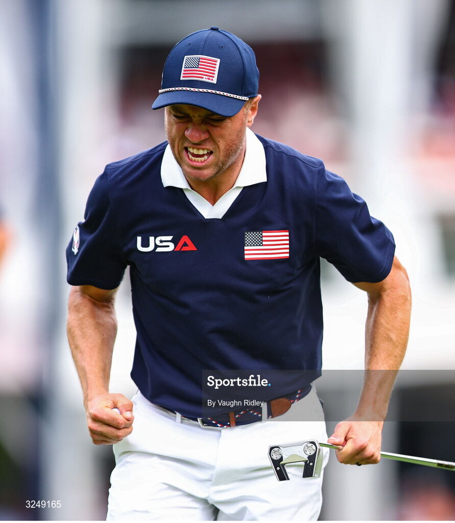 27 September 2025; Justin Thomas of USA celebrates after putting on the 16th green during the afternoon fourballs on day two of the 2025 Ryder Cup at Black Course at Bethpage State Park Golf Course in Farmingdale, New York, USA. Photo by Vaughn Ridley/Sportsfile