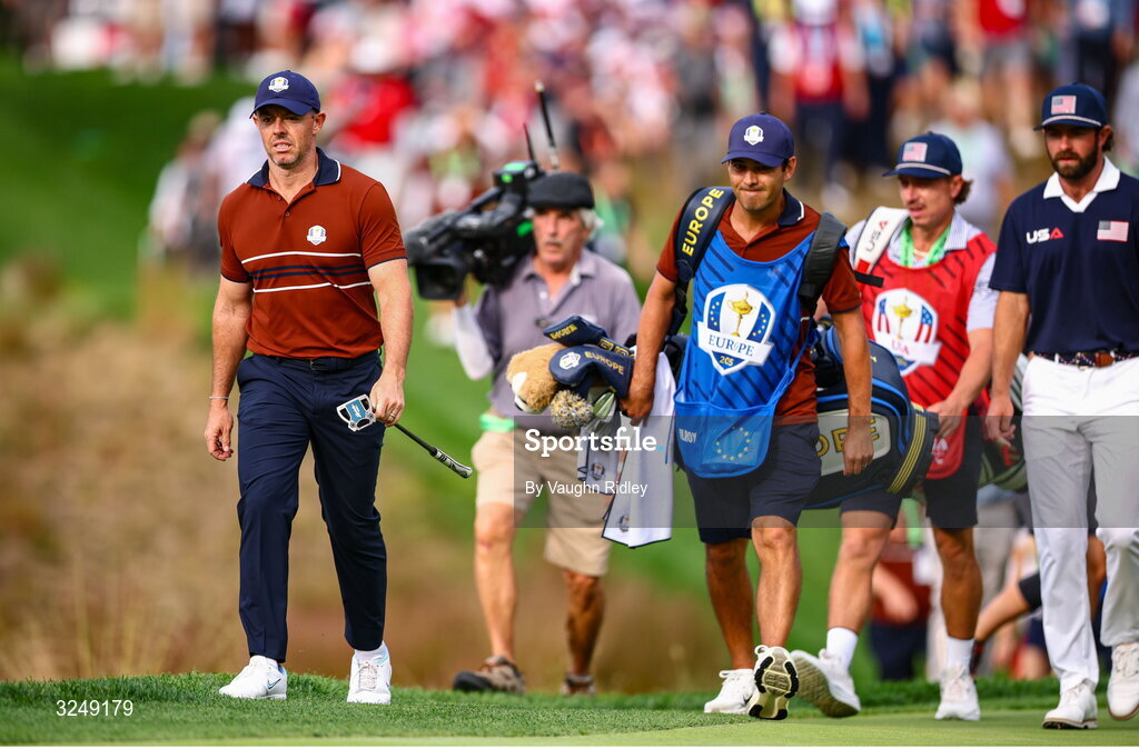 27 September 2025; Rory McIlroy of Europe, left, during the afternoon fourballs on day two of the 2025 Ryder Cup at Black Course at Bethpage State Park Golf Course in Farmingdale, New York, USA. Photo by Vaughn Ridley/Sportsfile