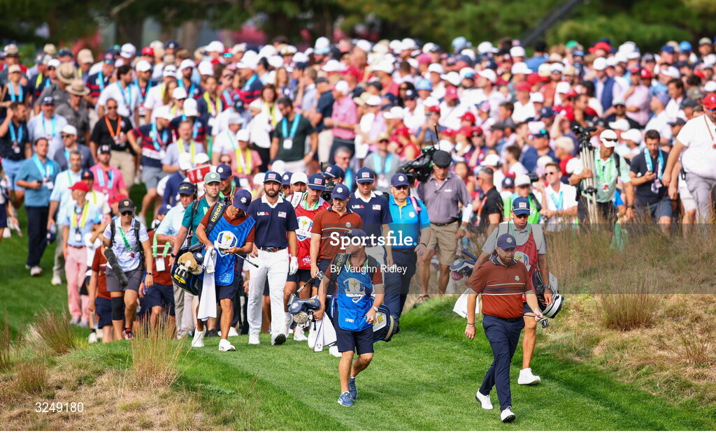 27 September 2025; Shane Lowry of Europe, bottom right, walks to the 14th green during the afternoon fourballs on day two of the 2025 Ryder Cup at Black Course at Bethpage State Park Golf Course in Farmingdale, New York, USA. Photo by Vaughn Ridley/Sportsfile