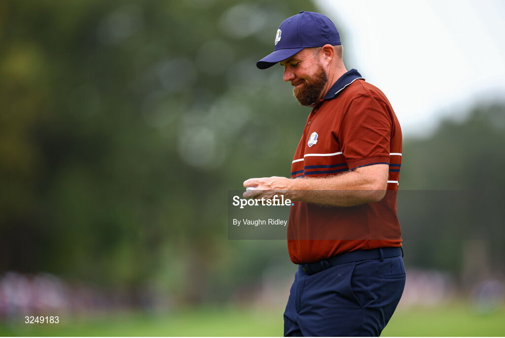 27 September 2025; Shane Lowry of Europe reacts after missing a putt on the 13th green during the afternoon fourballs on day two of the 2025 Ryder Cup at Black Course at Bethpage State Park Golf Course in Farmingdale, New York, USA. Photo by Vaughn Ridley/Sportsfile