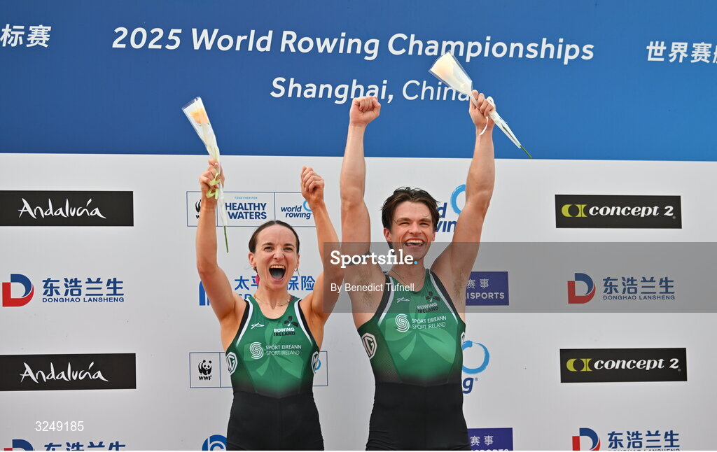 28 September 2025; Mags Cremen and Fintan McCarthy of team Ireland celebrate after winning Gold in the Mixed Double Scull final during the 2025 World Rowing Championships at the Shanghai Water Sports Centre in Shanghai, China. Photo by Benedict Tufnell/Sportsfile