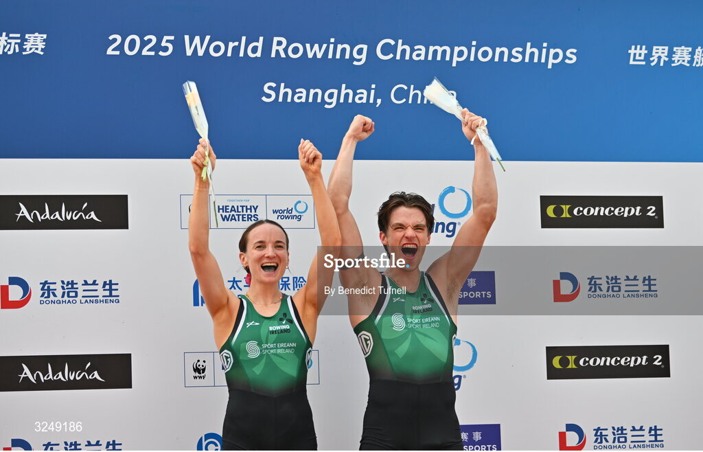 28 September 2025; Mags Cremen and Fintan McCarthy of team Ireland celebrate after winning Gold in the Mixed Double Scull final during the 2025 World Rowing Championships at the Shanghai Water Sports Centre in Shanghai, China. Photo by Benedict Tufnell/Sportsfile