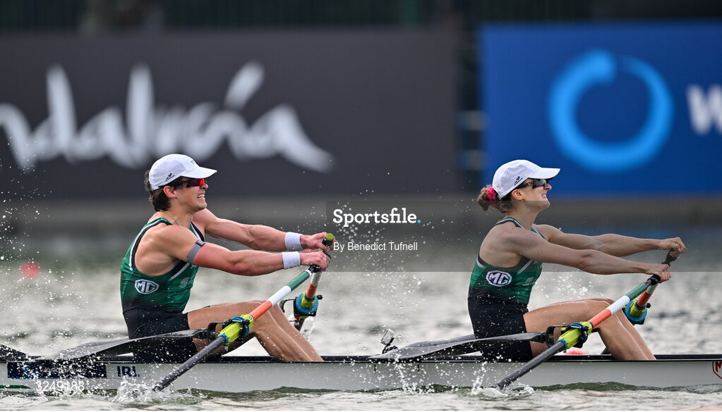 28 September 2025; Mags Cremen, right, and Fintan McCarthy of team Ireland on their way to winning the Mixed Double Scull final during the 2025 World Rowing Championships at the Shanghai Water Sports Centre in Shanghai, China. Photo by Benedict Tufnell/Sportsfile