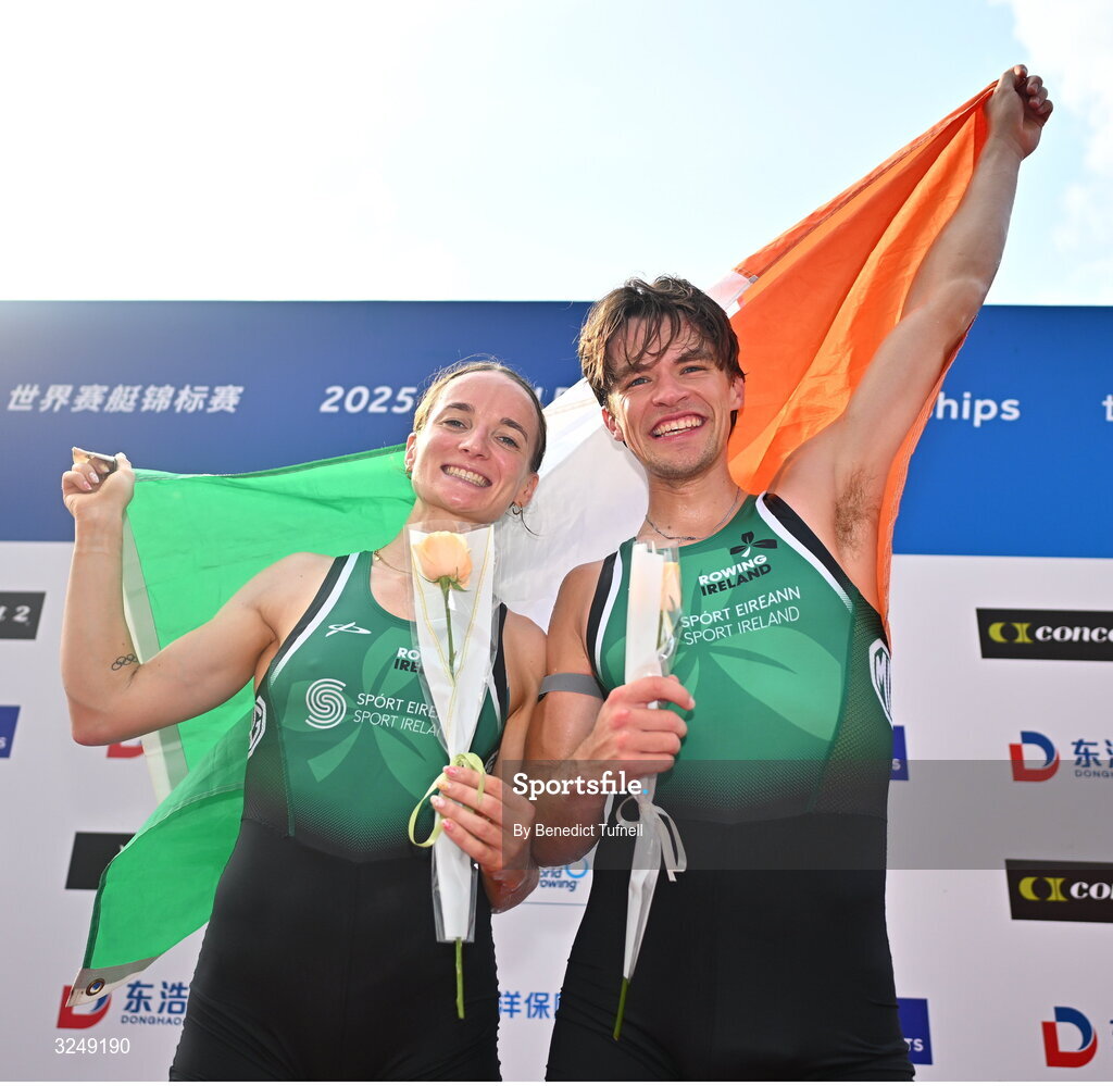 28 September 2025; Mags Cremen and Fintan McCarthy of team Ireland celebrate after winning Gold in the Mixed Double Scull final during the 2025 World Rowing Championships at the Shanghai Water Sports Centre in Shanghai, China. Photo by Benedict Tufnell/Sportsfile