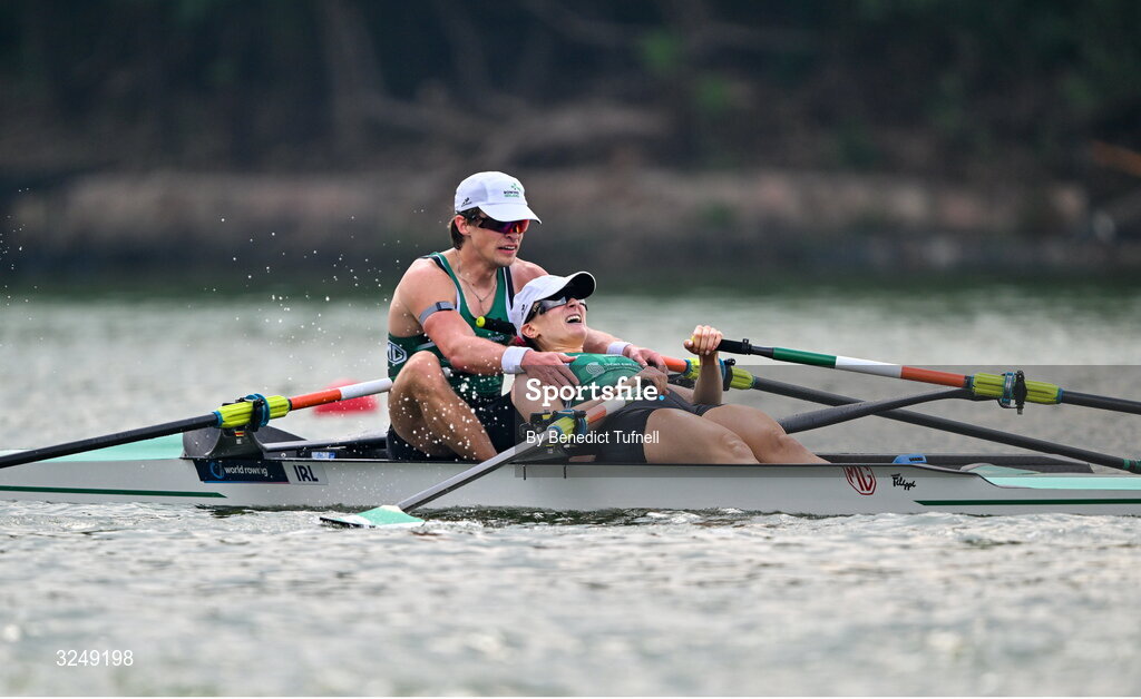 28 September 2025; Mags Cremen and Fintan McCarthy of team Ireland celebrate after winning Gold in the Mixed Double Scull final during the 2025 World Rowing Championships at the Shanghai Water Sports Centre in Shanghai, China. Photo by Benedict Tufnell/Sportsfile