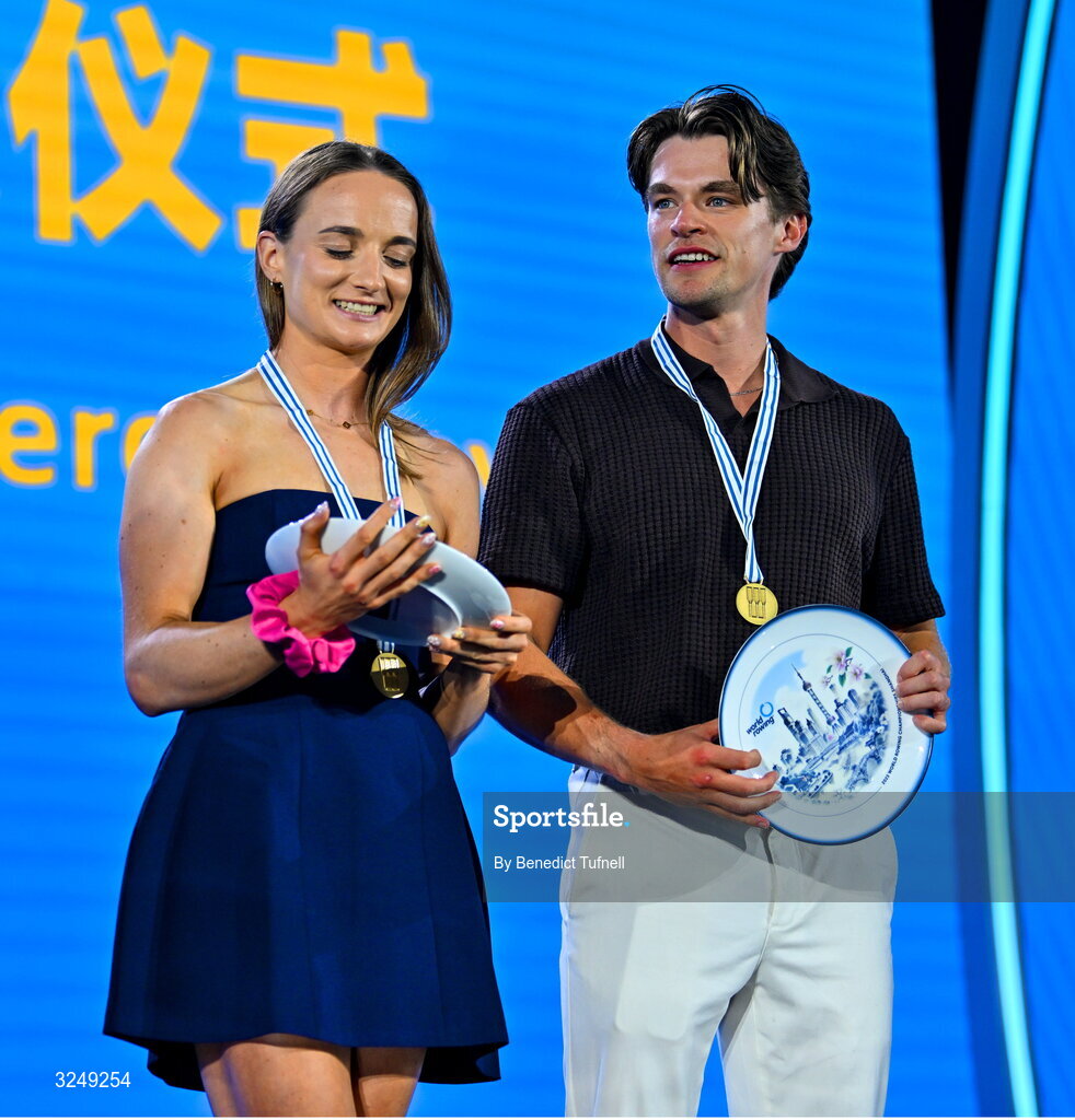 28 September 2025; Mags Cremen and Fintan McCarthy of team Ireland during the medal ceremony after winning Gold in the Mixed Double Scull final during the 2025 World Rowing Championships at the Shanghai Water Sports Centre in Shanghai, China. Photo by Benedict Tufnell/Sportsfile