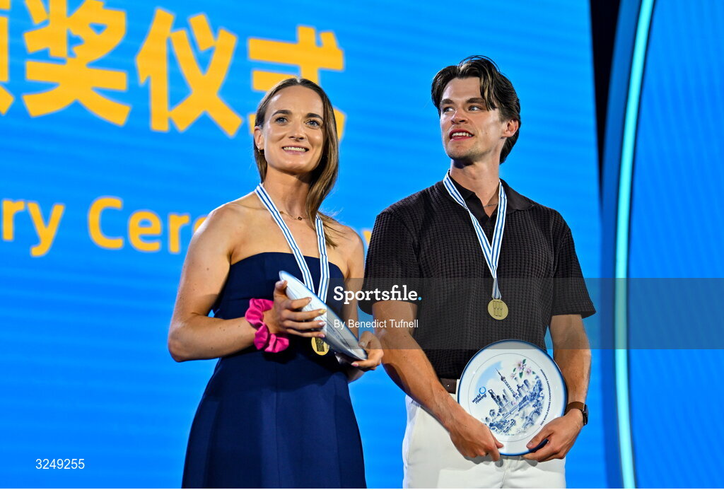 28 September 2025; Mags Cremen and Fintan McCarthy of team Ireland during the medal ceremony after winning Gold in the Mixed Double Scull final during the 2025 World Rowing Championships at the Shanghai Water Sports Centre in Shanghai, China. Photo by Benedict Tufnell/Sportsfile