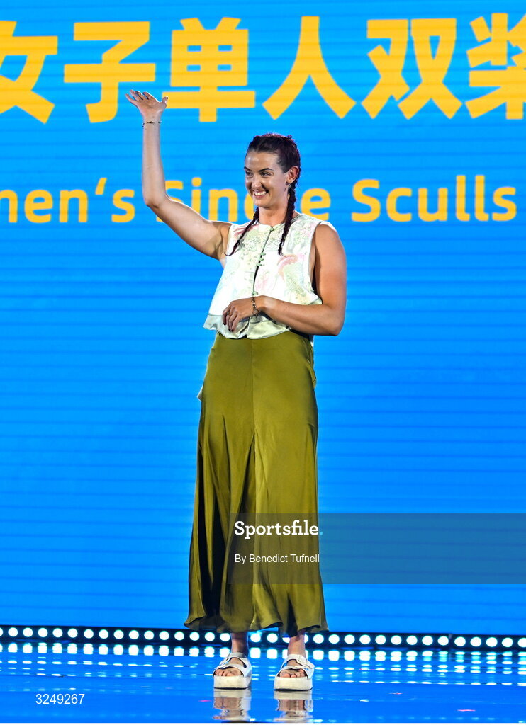 28 September 2025; Fiona Murtagh of team Ireland during the medal ceremony after winning Gold in the Women's Single Sculls final during the 2025 World Rowing Championships at the Shanghai Water Sports Centre in Shanghai, China. Photo by Benedict Tufnell/Sportsfile