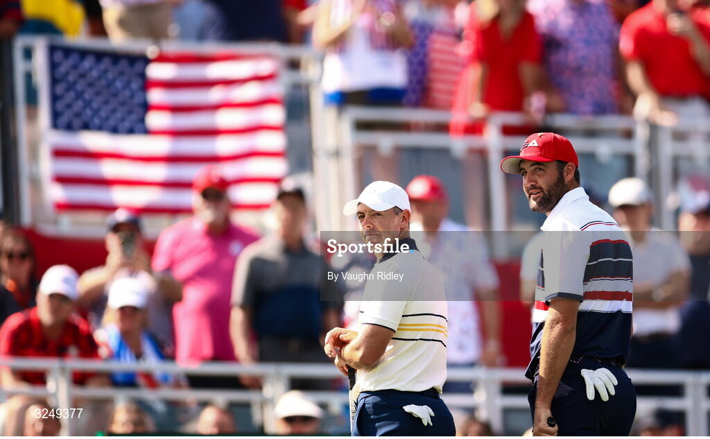 28 September 2025; Rory McIlroy of Europe, left, and Scottie Scheffler of USA on the 1st tee during the singles matches on day three of the 2025 Ryder Cup at Black Course at Bethpage State Park Golf Course in Farmingdale, New York, USA. Photo by Vaughn Ridley/Sportsfile