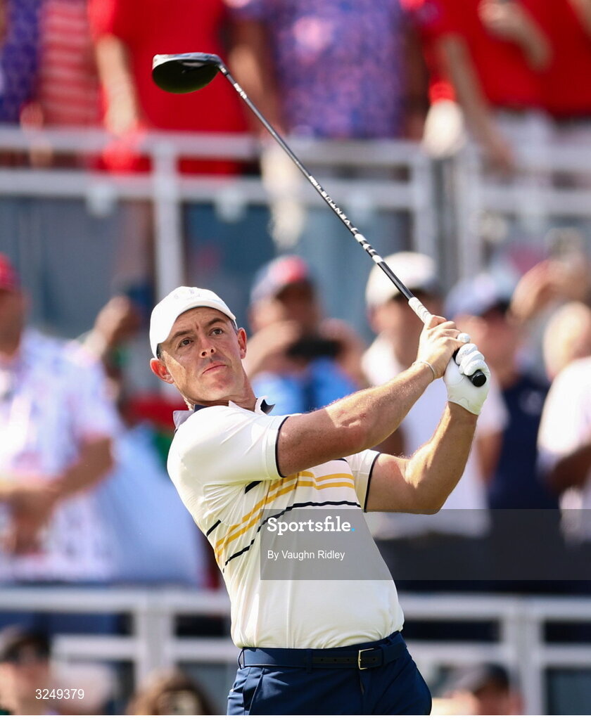 28 September 2025; Rory McIlroy of Europe watches his tee shot on the first hole during the singles matches on day three of the 2025 Ryder Cup at Black Course at Bethpage State Park Golf Course in Farmingdale, New York, USA. Photo by Vaughn Ridley/Sportsfile