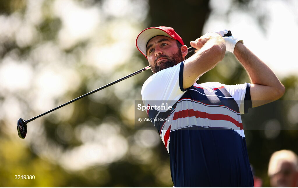 28 September 2025; Scottie Scheffler of USA watches his tee shot on the second hole during the singles matches on day three of the 2025 Ryder Cup at Black Course at Bethpage State Park Golf Course in Farmingdale, New York, USA. Photo by Vaughn Ridley/Sportsfile