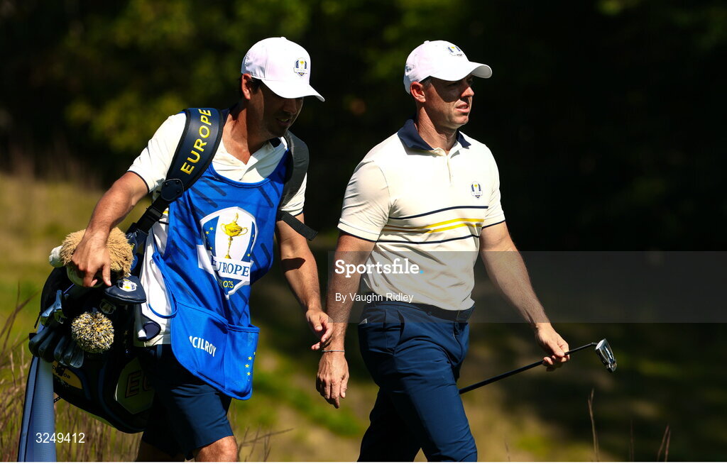 28 September 2025; Rory McIlroy of Europe and his caddie Harry Diamond during the singles matches on day three of the 2025 Ryder Cup at Black Course at Bethpage State Park Golf Course in Farmingdale, New York, USA. Photo by Vaughn Ridley/Sportsfile