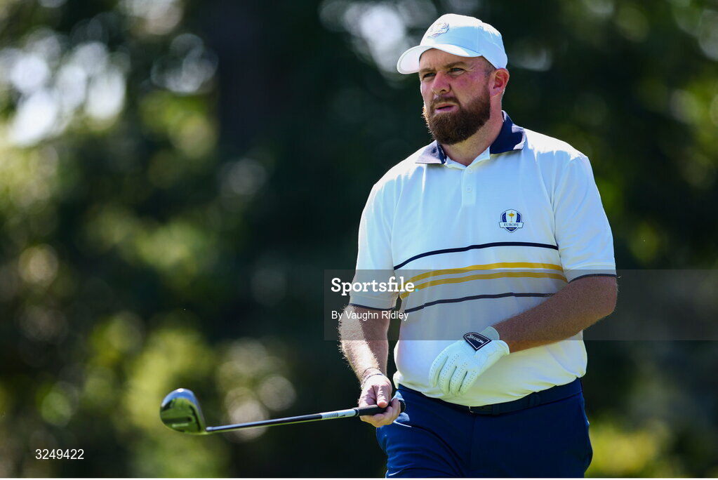 28 September 2025; Shane Lowry of Europe watches his tee shot on the second hole during the singles matches on day three of the 2025 Ryder Cup at Black Course at Bethpage State Park Golf Course in Farmingdale, New York, USA. Photo by Vaughn Ridley/Sportsfile