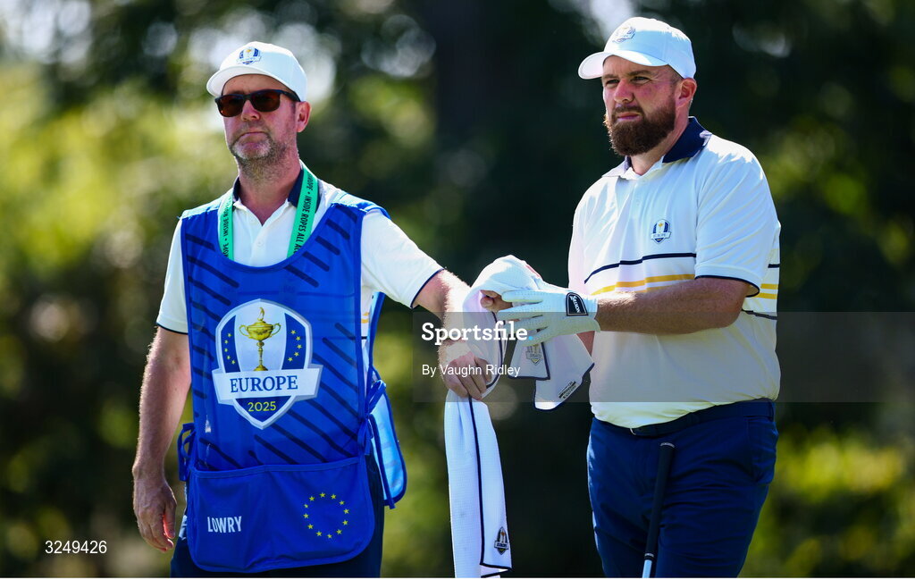 28 September 2025; Shane Lowry of Europe and his caddie Darren Reynolds during the singles matches on day three of the 2025 Ryder Cup at Black Course at Bethpage State Park Golf Course in Farmingdale, New York, USA. Photo by Vaughn Ridley/Sportsfile