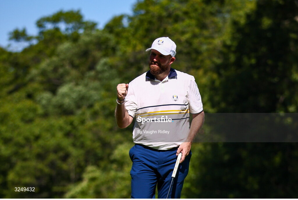 28 September 2025; Shane Lowry of Europe celebrates a putt on the third green during the singles matches on day three of the 2025 Ryder Cup at Black Course at Bethpage State Park Golf Course in Farmingdale, New York, USA. Photo by Vaughn Ridley/Sportsfile