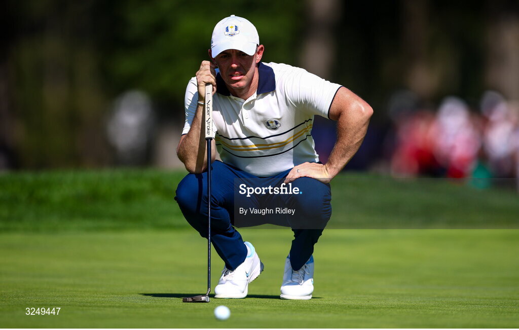 28 September 2025; Rory McIlroy of Europe lines up a putt on the ninth green during the singles matches on day three of the 2025 Ryder Cup at Black Course at Bethpage State Park Golf Course in Farmingdale, New York, USA. Photo by Vaughn Ridley/Sportsfile