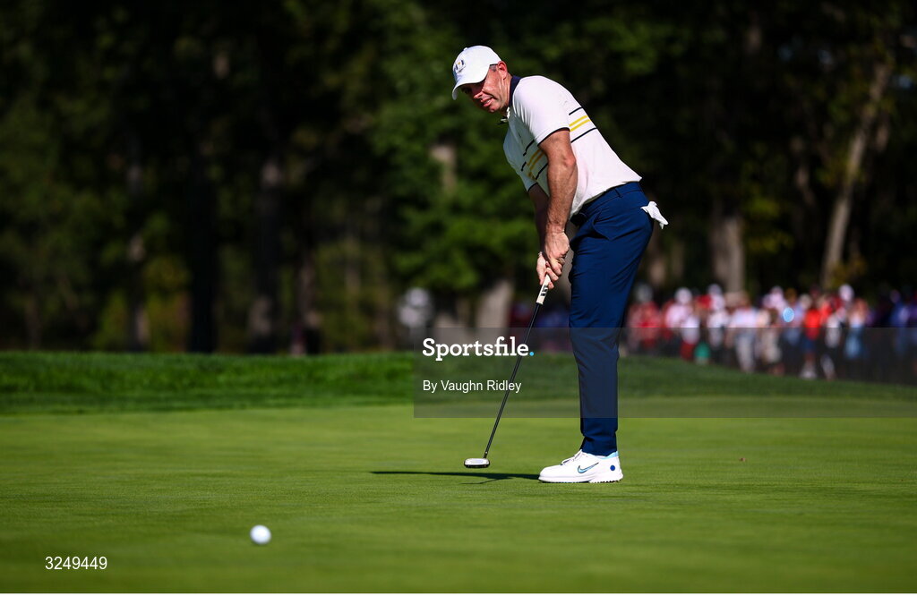 28 September 2025; Rory McIlroy of Europe putts on the ninth green during the singles matches on day three of the 2025 Ryder Cup at Black Course at Bethpage State Park Golf Course in Farmingdale, New York, USA. Photo by Vaughn Ridley/Sportsfile