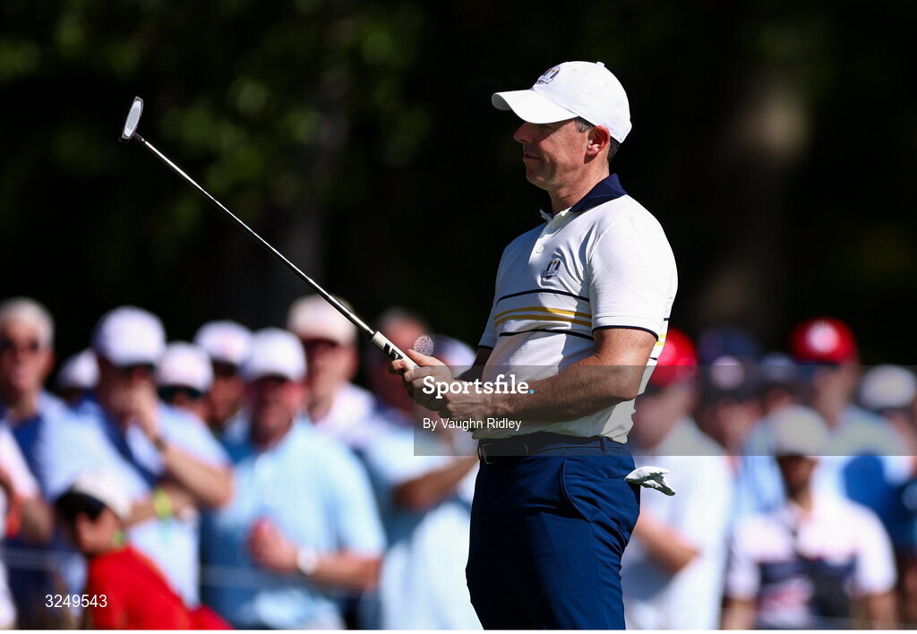 28 September 2025; Rory McIlroy of Europe reacts on the 10th green during the singles matches on day three of the 2025 Ryder Cup at Black Course at Bethpage State Park Golf Course in Farmingdale, New York, USA. Photo by Vaughn Ridley/Sportsfile