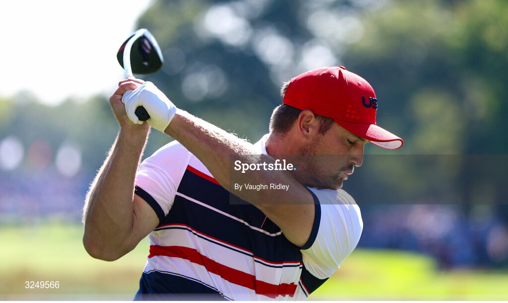 28 September 2025; Bryson DeChambeau of USA plays his tee shot on the 13th hole during the singles matches on day three of the 2025 Ryder Cup at Black Course at Bethpage State Park Golf Course in Farmingdale, New York, USA. Photo by Vaughn Ridley/Sportsfile