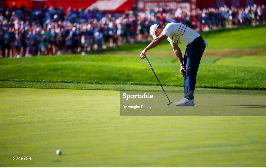 28 September 2025; Rory McIlroy of Europe reacts after a missed putt during the singles matches on day three of the 2025 Ryder Cup at Black Course at Bethpage State Park Golf Course in Farmingdale, New York, USA. Photo by Vaughn Ridley/Sportsfile