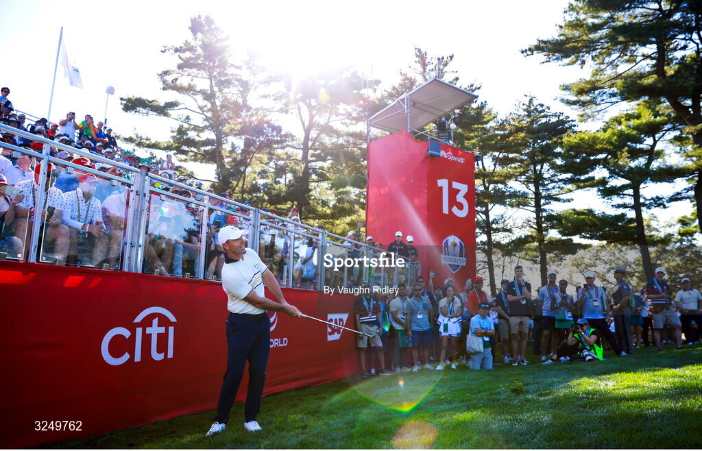 28 September 2025; Rory McIlroy of Europe plays from the rough on the 13th hole during the singles matches on day three of the 2025 Ryder Cup at Black Course at Bethpage State Park Golf Course in Farmingdale, New York, USA. Photo by Vaughn Ridley/Sportsfile