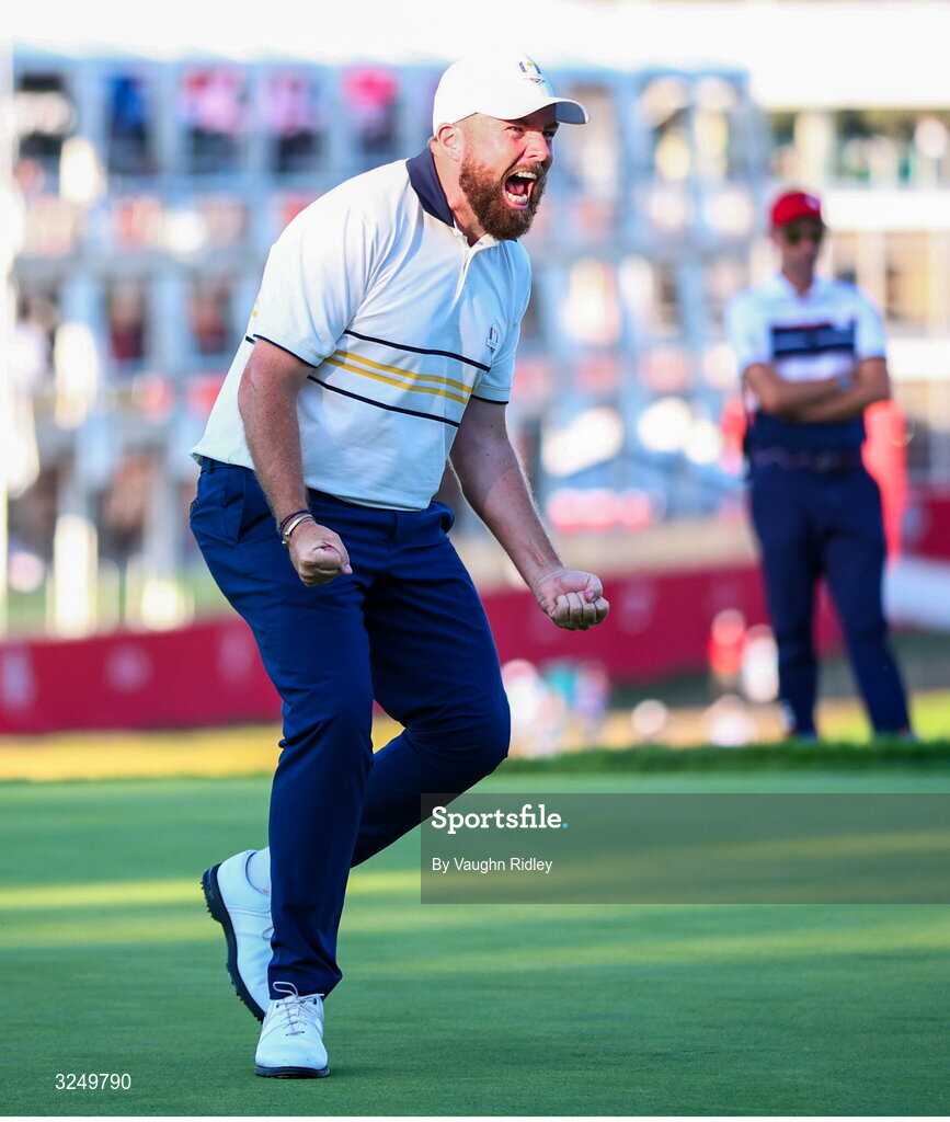 28 September 2025; Shane Lowry of Europe celebrates on the 18th green during the singles matches on day three of the 2025 Ryder Cup at Black Course at Bethpage State Park Golf Course in Farmingdale, New York, USA. Photo by Vaughn Ridley/Sportsfile
