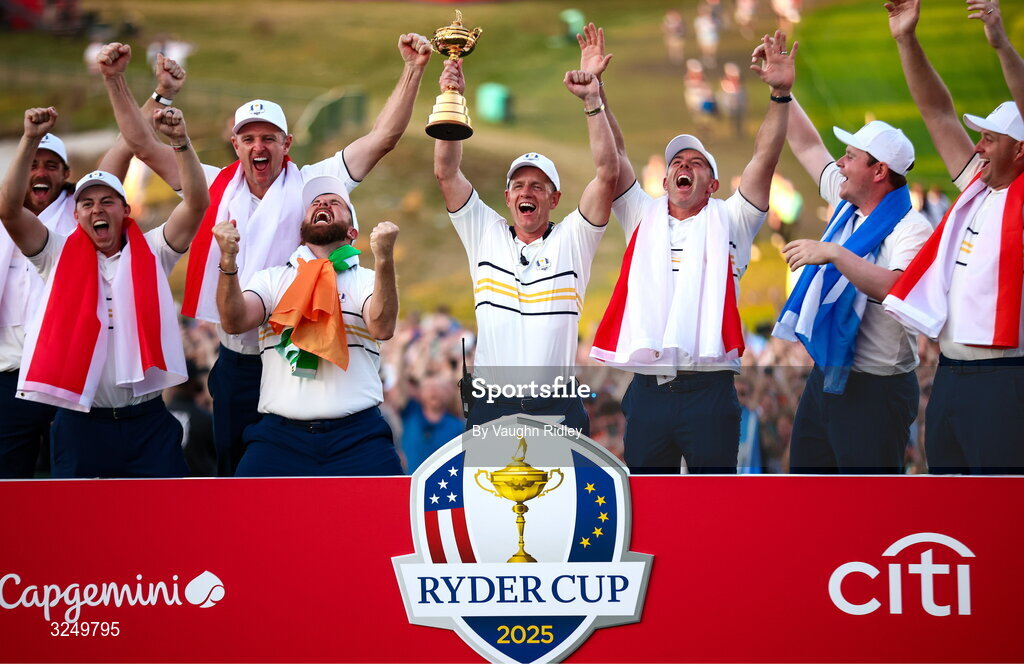 28 September 2025; Europe captain Luke Donald celebrates with the Ryder Cup on day three of the 2025 Ryder Cup at Black Course at Bethpage State Park Golf Course in Farmingdale, New York, USA. Photo by Vaughn Ridley/Sportsfile