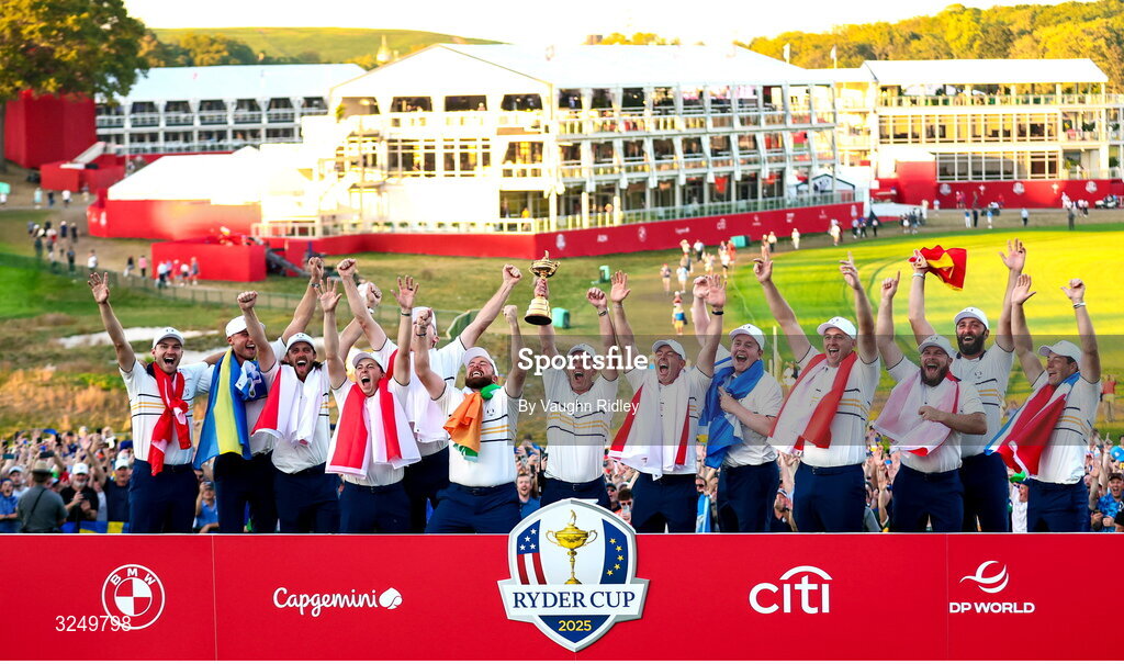 28 September 2025; Europe captain Luke Donald lifts the Ryder Cup on day three of the 2025 Ryder Cup at Black Course at Bethpage State Park Golf Course in Farmingdale, New York, USA. Photo by Vaughn Ridley/Sportsfile
