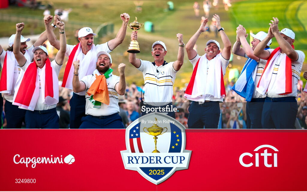 28 September 2025; Europe captain Luke Donald celebrates with the Ryder Cup and players, including Matt Fitzpatrick, Shane Lowry and Rory McIlroy on day three of the 2025 Ryder Cup at Black Course at Bethpage State Park Golf Course in Farmingdale, New York, USA. Photo by Vaughn Ridley/Sportsfile